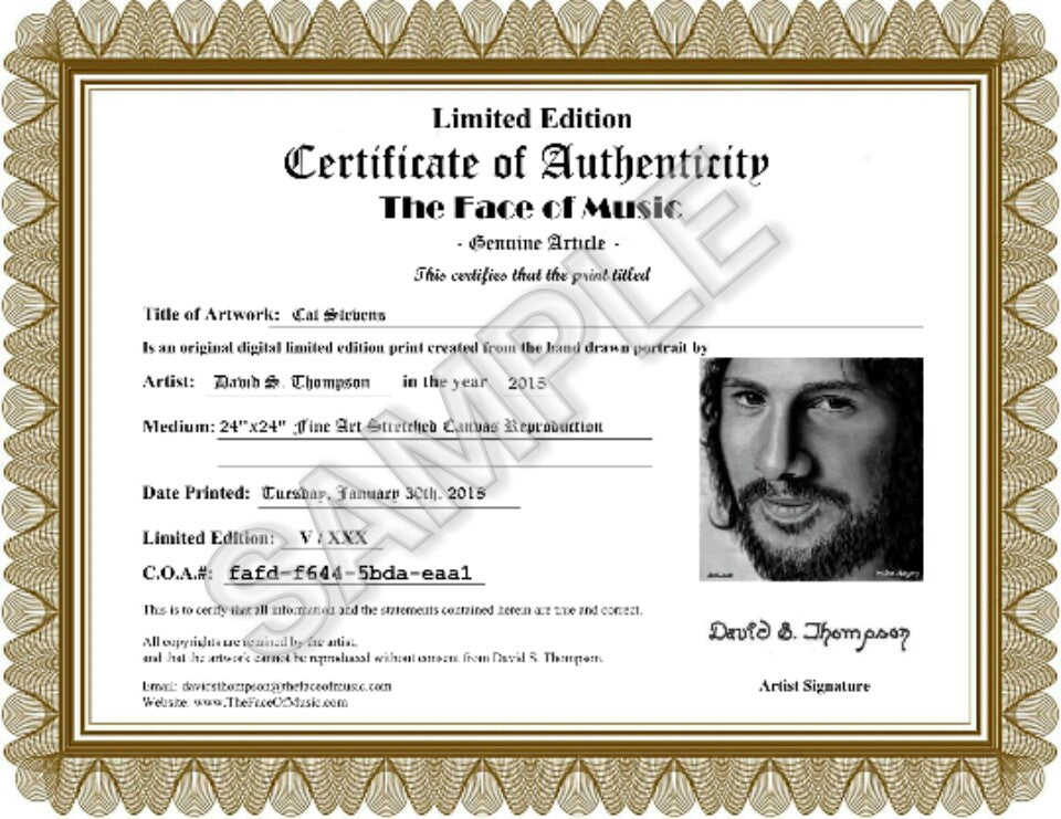 Each artwork is personally signed and is accompanied with an individual Limited Edition Certificate of Authenticity with its own unique C.O.A. Number and personal signature ensuring you're getting a unique The Face of Music portrait by Master Artist David S. Thompson.