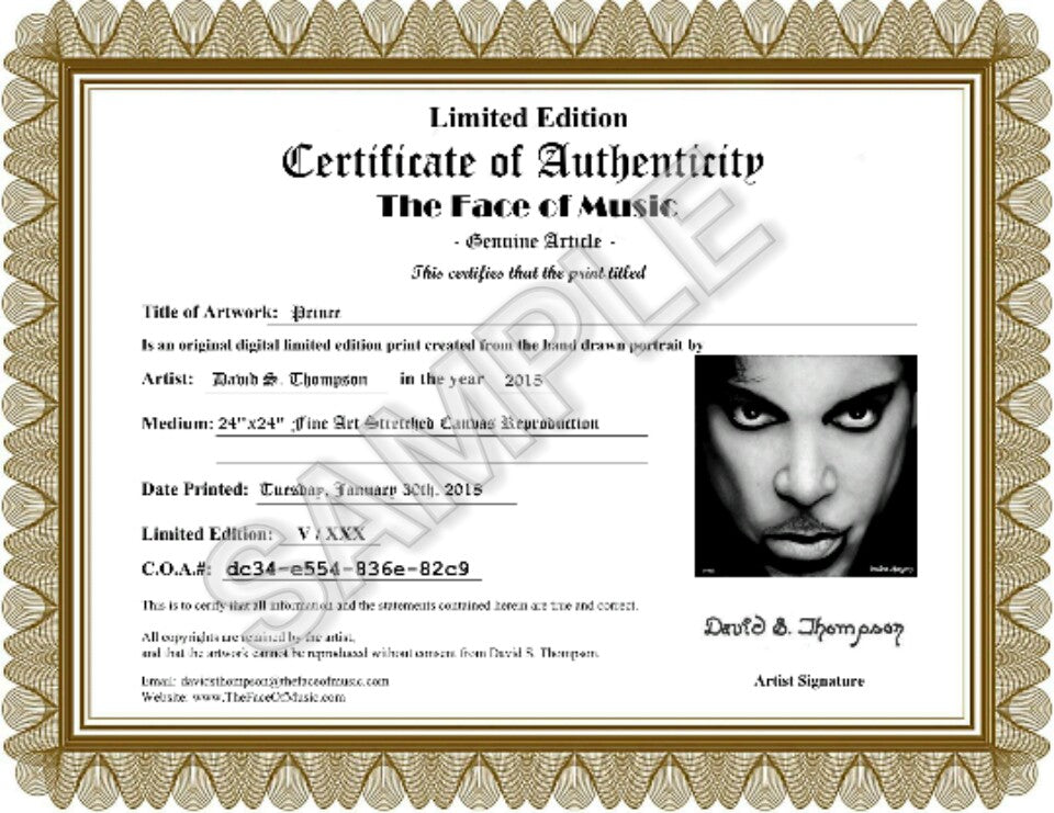 Each artwork is personally signed and is accompanied with an individual Limited Edition Certificate of Authenticity with its own unique C.O.A. Number and personal signature ensuring you're getting a unique The Face of Music portrait by Master Artist David S. Thompson.