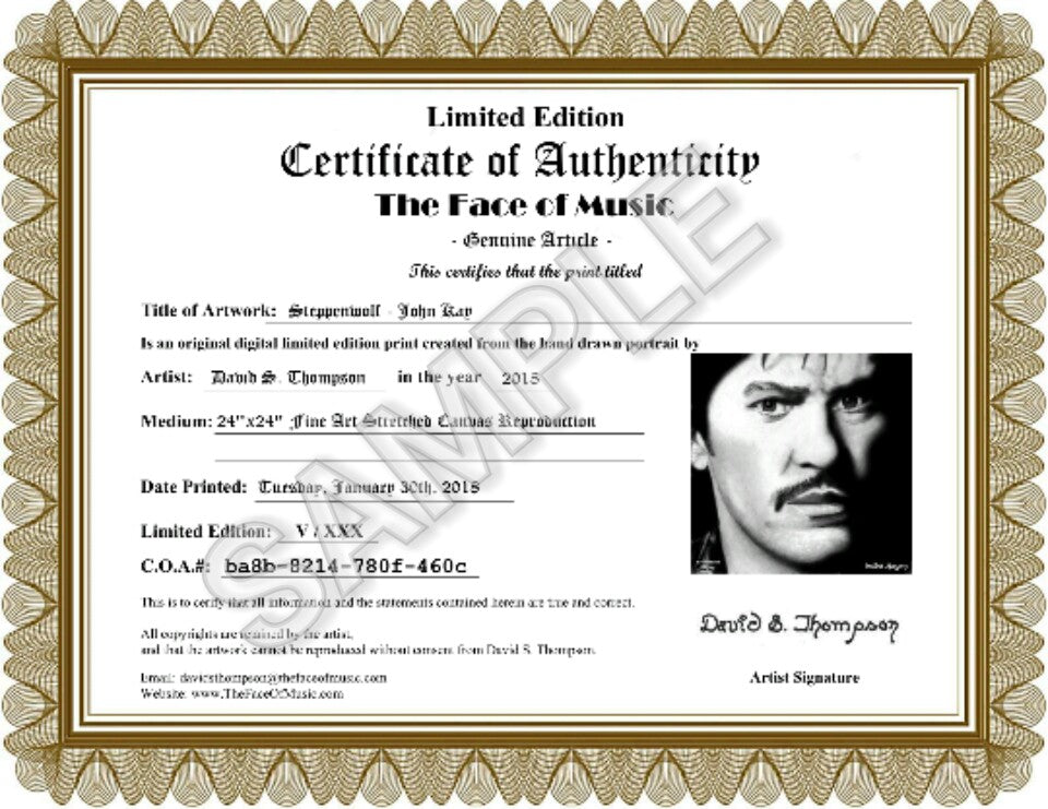 Each artwork is personally signed and is accompanied with an individual Limited Edition Certificate of Authenticity with its own unique C.O.A. Number and personal signature ensuring you're getting a unique The Face of Music portrait by Master Artist David S. Thompson.