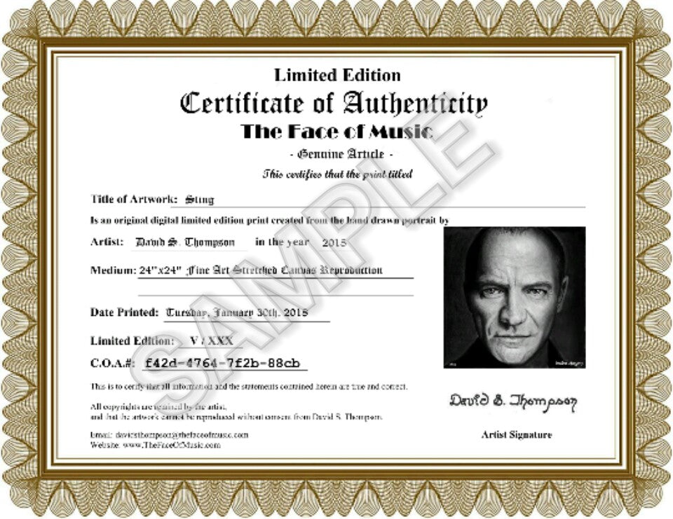 Each artwork is personally signed and is accompanied with an individual Limited Edition Certificate of Authenticity with its own unique C.O.A. Number and personal signature ensuring you're getting a unique The Face of Music portrait by Master Artist David S. Thompson.